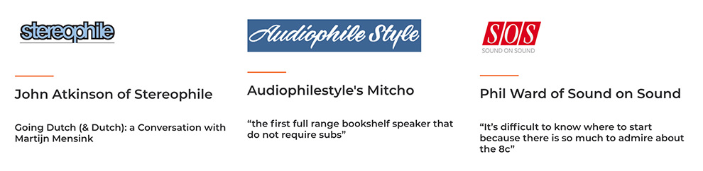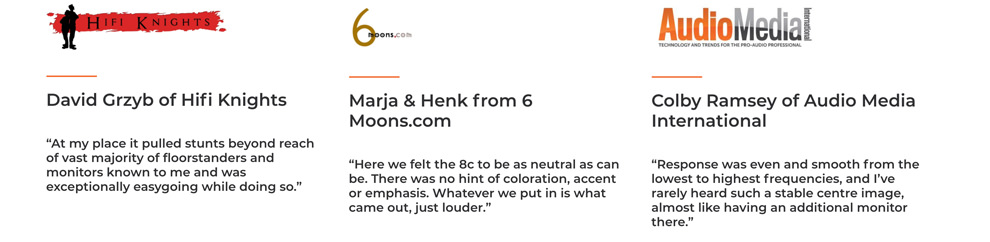 Bunu başarmak için, 8c'ler tescilli bir özel bir 1" tweeter'ı akustik kardioid 8" orta bant sürücüsü ve çiftli 8" bas sürücülerini ve aktif oda eşleşmesi "DSP" ile birleştirir. Sonuç: herhangi bir odada mükemmel akustik sunumdur.