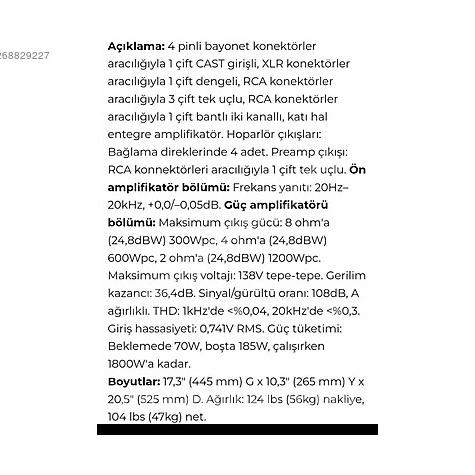 Severek kullandığım amfimi başka bir proje için satmaktayım. Araştırma yaparsanız ne kadar uyguna verdiğimi görmüş olacaksınız. Dan D'Agostino tarafından üretilmiş bu amfi A sınıfı devre topolojisine sahiptir.300 w 8 ohm,600 w 4 ohm,1200 w 2 ohm gücü ile tartışılmaz bir tank ünvanı almıştır. Süremeyeceği bir hoparlör olduğunu düşünmüyorum. Kozmetik olarak 10 üzerinden 9,5 alır.Genel olarak bilinen meşhur Krell'in sesinden farklıdır. Çok daha yumuşak lambalı amfiler tadında ve bir o kadarda güçlü bir alettir.